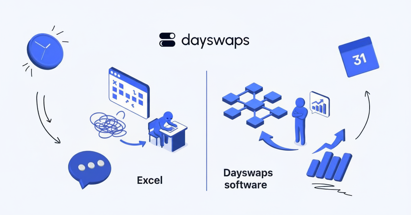 Mnoho manažerů nám vypráví stejný příběh: „Před Dayswaps jsem každou neděli trávil hodiny tím, že jsem v Excelu kopíroval buňky z minulého týdne a modlil se, aby seděly vzorce.“ Ruční plánování směn v Excelu není jen otravné, je to žrout času. Malá chyba v řádku může rozhodit celý rozpis.
